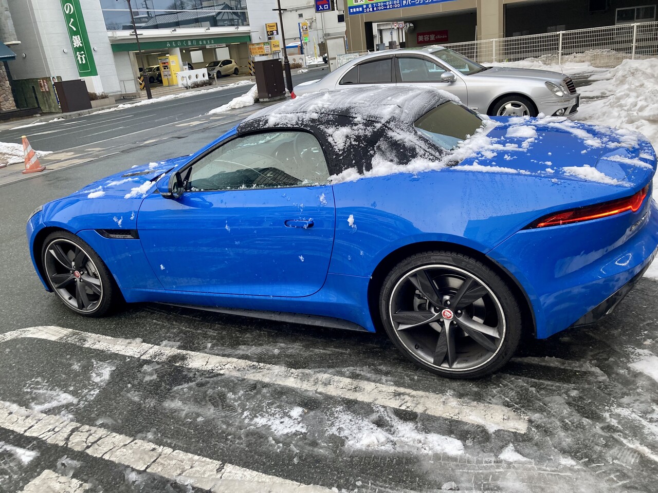 いつもは屋根付きガレージに保存しているジャガーFタイプですが、昨夜は屋根のない駐車場に駐めて、雪まみれにになってしまいました。