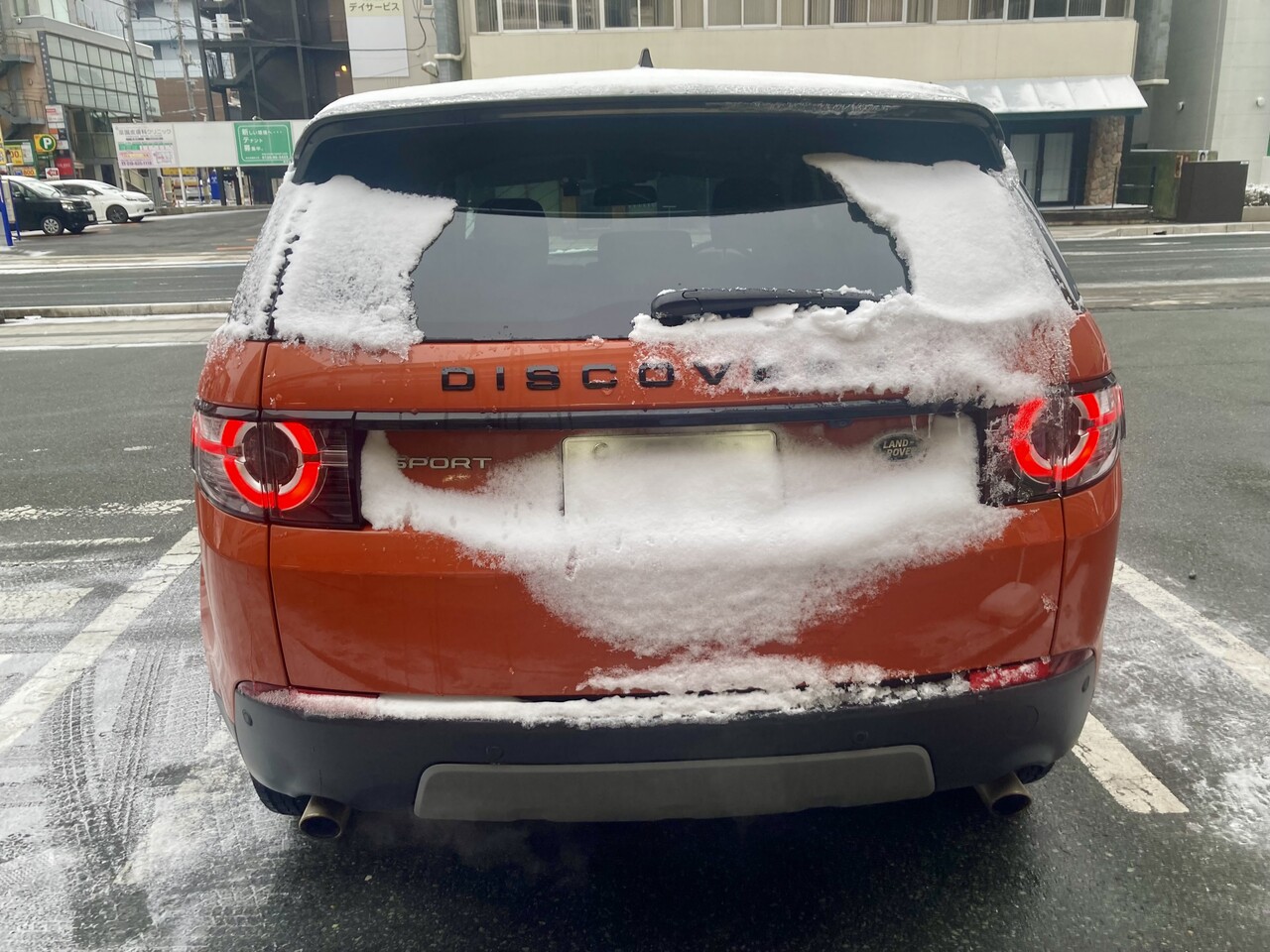 一夜明けて、ランドローバー・ディスカバリー・スポーツを見に行きますと、雪がスプレー状に吹き付けられた状態でした。