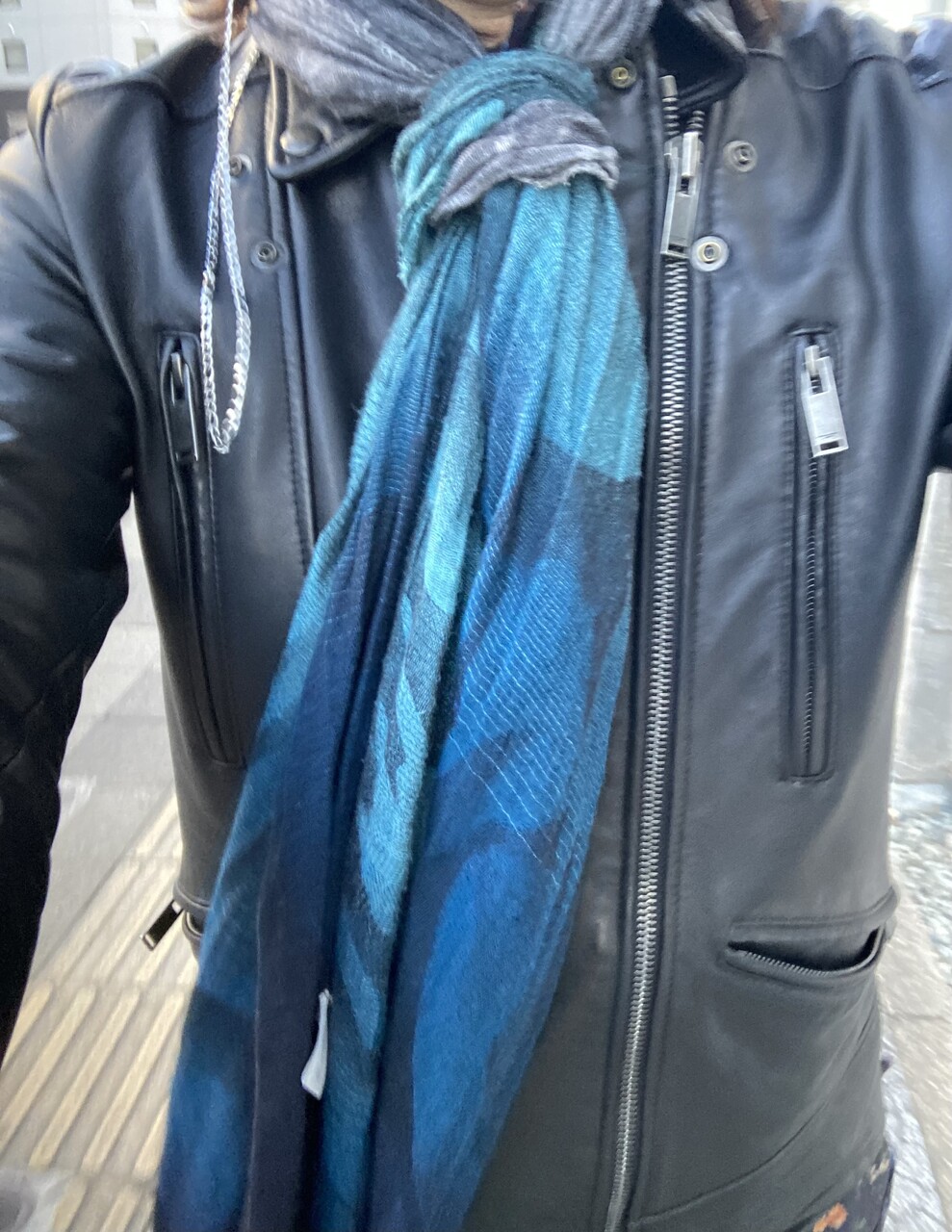 首元のストールは、ライダースは意外に首元が寒いのと、オシャレのアクセントとして巻いています。