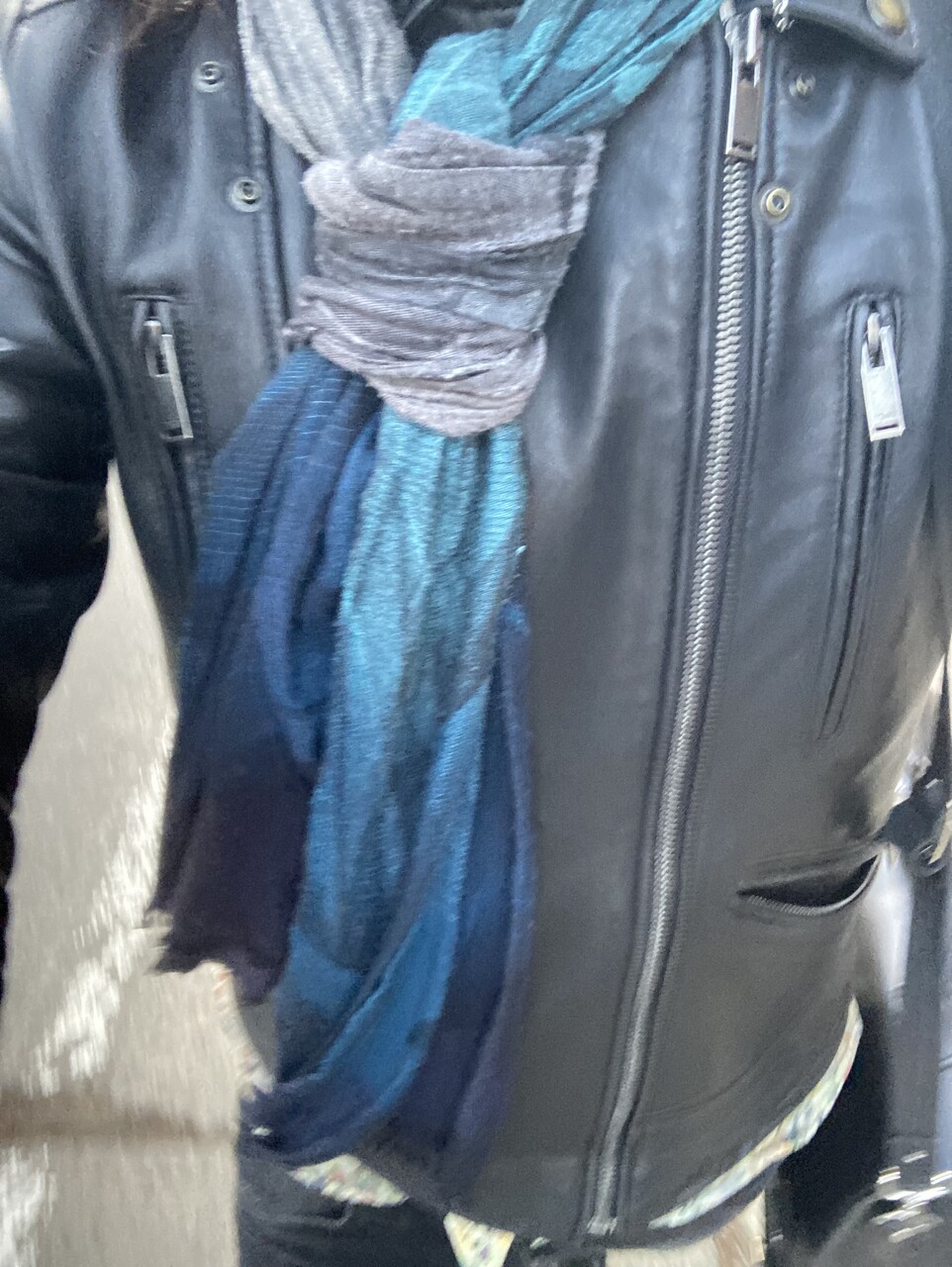 私のライダースジャケットの着こなしは、ダブルのライダースジャケットの前を閉めて、首にストールを巻くというコーディネートです。