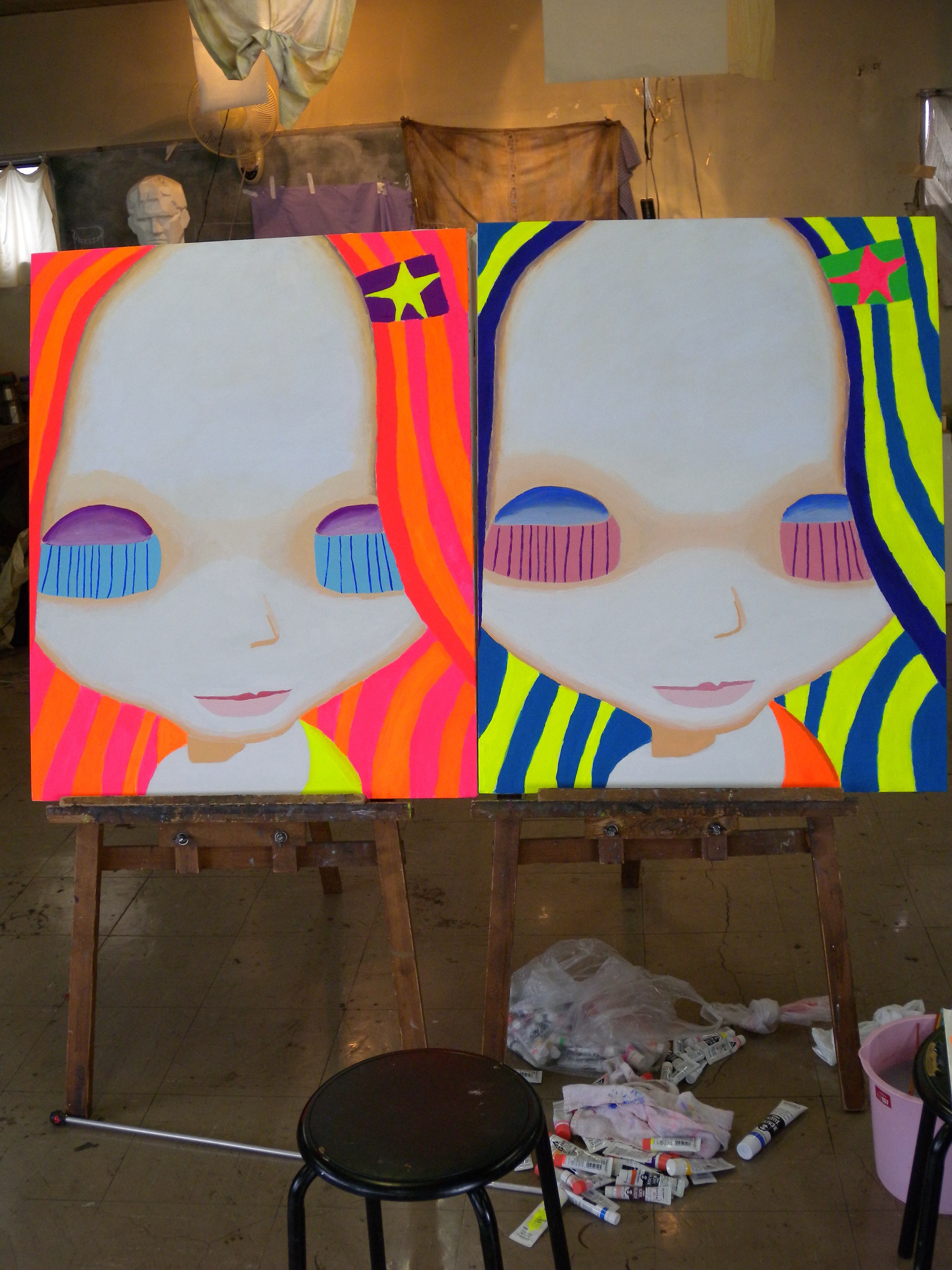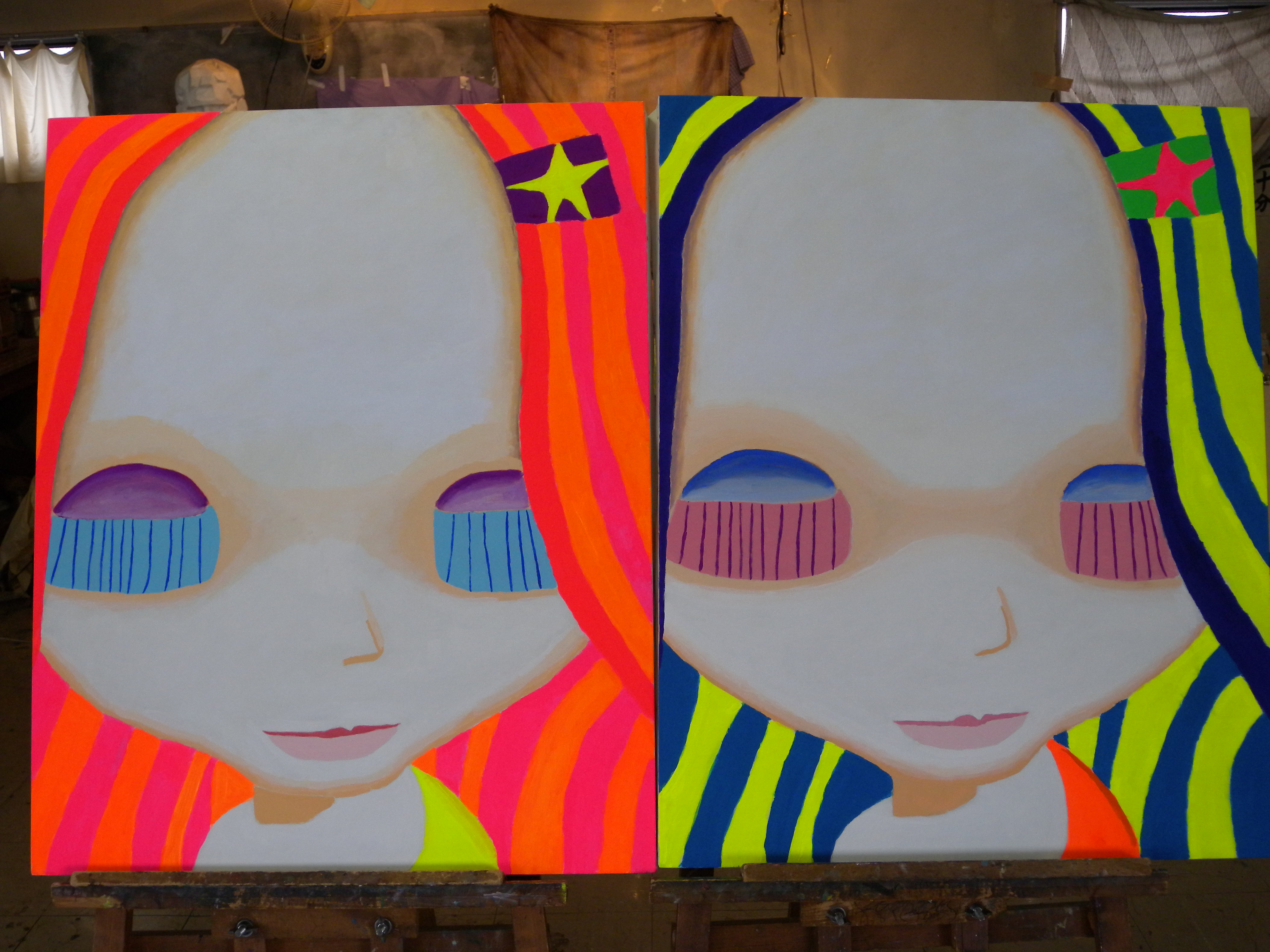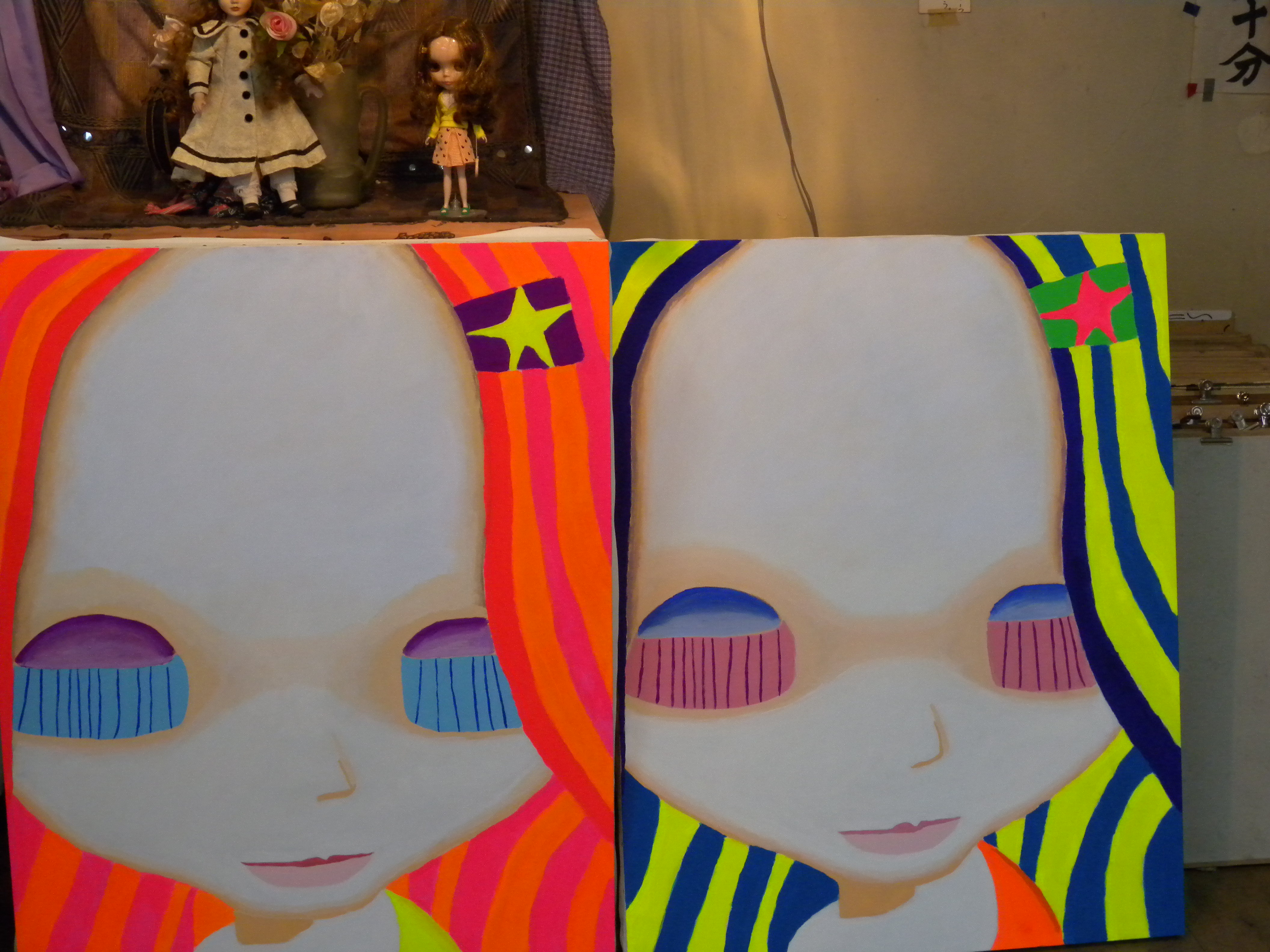 二枚一組になったのは、オレンジのブライスちゃんが完成した時に、大宮政郎先生が、『もう一枚、色違いで描いてみては』とアドバイスを頂いたことに由来します。